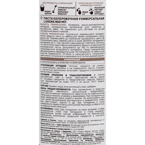 | Инструкция по применению | СПОСОБ ПРИМЕНЕНИЯ Тщательно перемешайте пасту. Затем введите пасту в небольшом объеме колеруемого материала. Перемешайте до получения однородного цвета. Полученную смесь перемешайте со всем объемом колеруемого материала. При ручном смешивании повторно получить тот же оттенок практически невозможно. Вводить в краску до 5% колеровочной пасты. Допускается до 10% по рекомендации производителя колеруемого материала. Перед применением рекомендовано предварительное тестирование на небольшом участке поверхности. Оттенок и насыщенность полученного цвета могут отличаться в зависимости от используемой краски. ИНФОРМАЦИЯ Не использовать как самостоятельное красящее средство. УТИЛИЗАЦИЯ ОТХОДОВ: Остатки продукта не сливать в канализацию, Водоемы и на поверхность грунта. Упаковку с полностью высохшими остатками продукта утилизировать как бытовой мусор. |