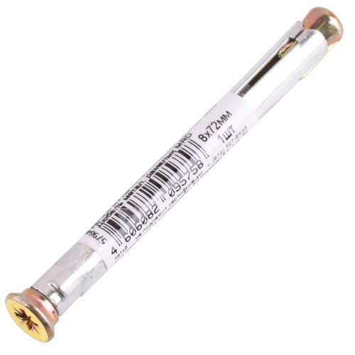 Рамный анкер-дюбель 8х72 состоит из трех элементов — винта с потайной головкой с резьбой М6 длиной 72 миллиметров, втулки конусной формы с внутренней резьбой М6 и двухраспорного цилиндра (штифта) внешним диаметром 8 миллиметров. При ввинчивании винта (шурупа), конический элемент движется навстречу резьбы, расширяя штифт, который за счет силы трения фиксируется в основании.