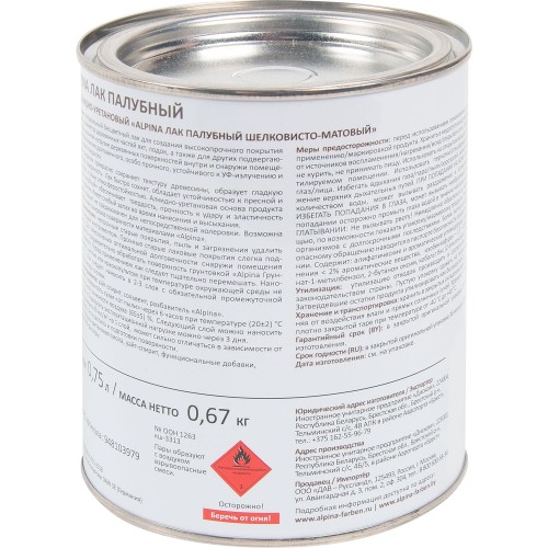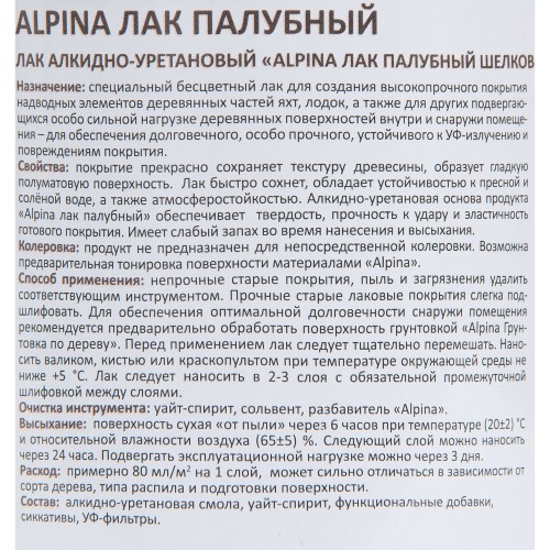 Инструкция по применению Наносить краскопультом, кистью или валиком для алкидных лаков и эмалей. Инструменты после использования очистить разбавителем "Alpina", уайт-спиритом или сольвентом. перед использованием тщательно перемешать. Лак следует наносить в 2- 3 слоя с обязательной промежуточной шлифовкой между слоями. Alpina Лак палубный при необходимости непосредственно перед нанесением добавить разбавитель "Alpina" не более 10% от массы продукта, затем тщательно перемешать до однородности продукта