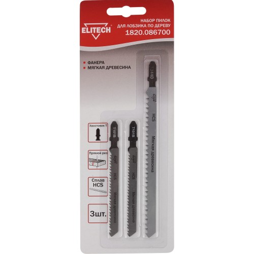 Набор пилок для лобзика по дереву Elitech 1820.086700, 3 шт.