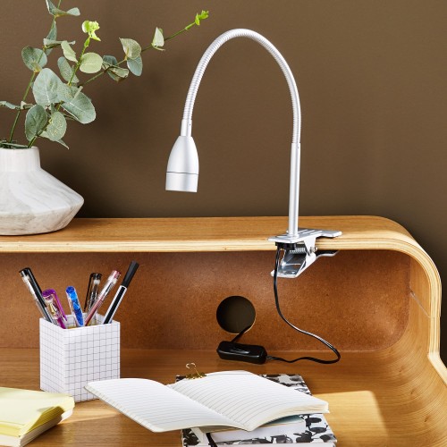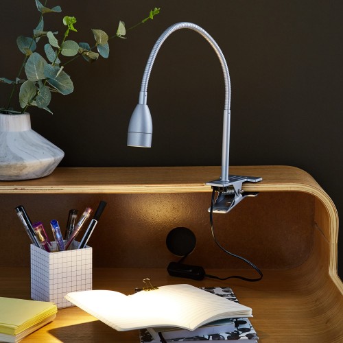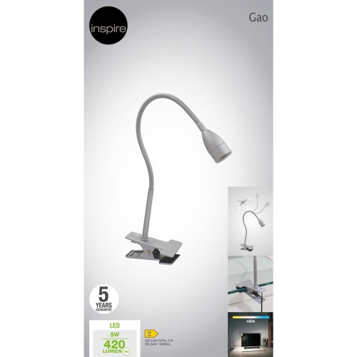 Настольная лампа светодиодная Inspire Gao идеально подходит для того, чтобы сопровождать вас во время работы или чтения. Полностью гибкая, может быть закреплена на поверхности, например, на столе, чтобы осветить область по вашему выбору. Выключатель на кабеле питания. Цвет лампы - серый.