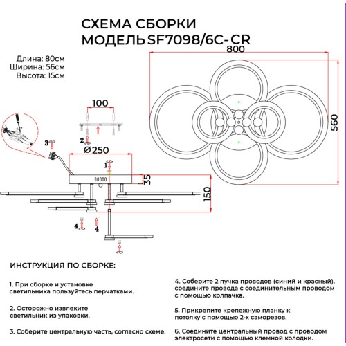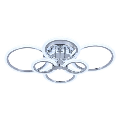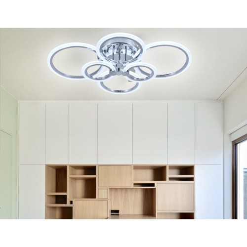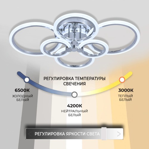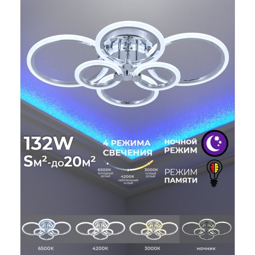 Люстра потолочная Семь огней SF7098/6C-CR LED предназначена для установки в жилых и общественных помещениях. Способна осветить площадь до 18 м². Пульт ДУ позволяет регулировать яркость освещения. Температура цвета может меняться от 3000 до 6000 К. Основной материал устройства — акрил серебристого цвета с матовой поверхностью. Плафоны сделаны из металла. Подходит для монтажа к натяжному и низкому потолкам (до 2,5 м).