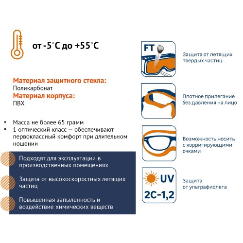 Лёгкие и удобные очки с прямой вентиляцией в мягком корпусе из ПВХ и регулируемой наголовной лентой с защитным стеклом из бесцветного поликарбоната. Отлично защищают от воздействия высокоскоростных частиц, капель жидкостей и ультрафиолета. Область применения: ландшафтные работы, работы по техническому обслуживанию, механическая обработка твердых материалов, слесарные, столярные, ремонтные работы, строительство, а также бытовые работы с инструментом. Вес — 60 г. Страна производитель - Россия.