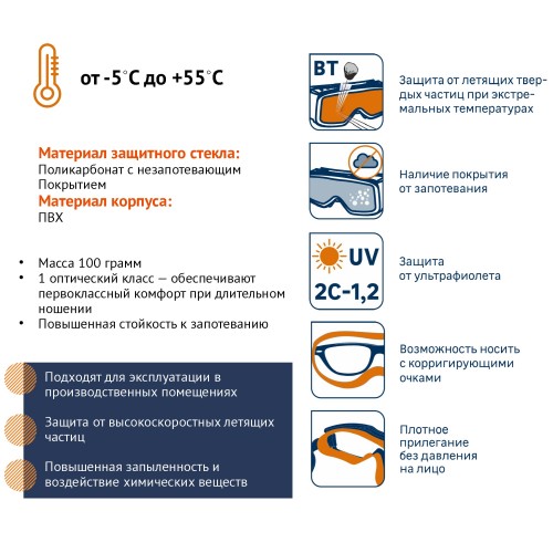 Очки с прямой вентиляцией с панорамным защитным бесцветным стеклом из поликарбоната с незапотевающим покрытием изнутри, снаружи устойчивым к истиранию и царапанию. Обеспечивают защиту глаз от воздействия летящих твердых частиц, капель жидкостей, пыли, УФ-излучения. Область применения: ландшафтные работы, работы по техническому обслуживанию, механическая обработка твердых материалов, слесарные, столярные, ремонтные работы, строительство, а также бытовые работы с инструментом. Вес- 96 г. Страна производитель — Россия.