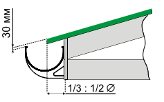 • Свес крыши располагается над желобом на расстоянии от 1/3 до 1/2 его диаметра.