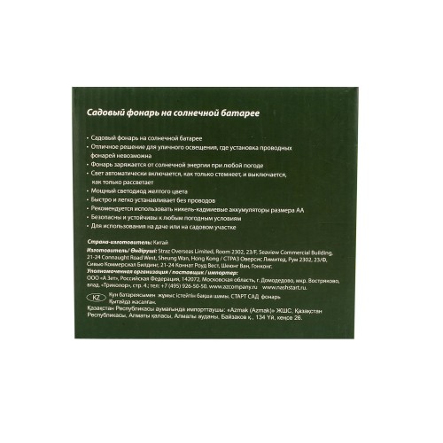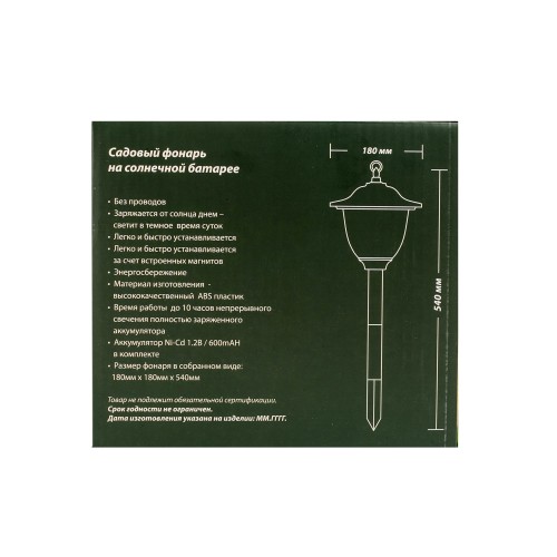 Фонарь Старт «Сад» используется для декоративной подсветки придомовой территории, освещения дорожек и приусадебного участка в вечернее и ночное время при отсутствии стационарного освещения. Представляет собой светильник классической формы, дополнительно используемый как элемент ландшафтного дизайна. Легко устанавливается в любом удобном месте благодаря отсутствию проводов и длинной конусообразной ножке. Высота светильника — 54 см.