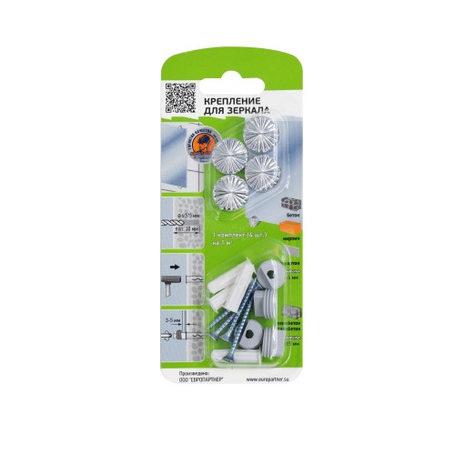 Комплект крепления зеркал Европартнер, предназначен для фиксации зеркал, в любых материалах оснований; бетоне, пустотелом и полнотелом кирпиче, гипсокартоне, а так же в пенобетоне и газобетоне. Круглые держатели втулки обхватывают зеркало сверху и снизу, плотно прижимая его к стене. Колпачок покрыт однокомпонентной эмалью для пластмасс с последующим защитным слоем лака. Такое покрытие имеет высокие показатели стойкости к спиртосодержащим веществам, кремам, моющим средствам и истиранию. Один комплект крепления рассчитан на установку зеркала толщиной от 3 мм до 5 мм и общей площадью до 1 м2.
