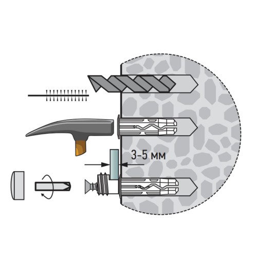 • Просверлите отверстие диаметром 6 мм (бетон, кирпич, гипсокартон), диаметром 5 мм (пенобетон, газобетон).