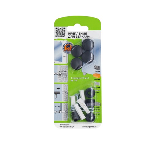 Комплект крепления зеркал Европартнер, предназначен для фиксации зеркал, в любых материалах оснований; бетоне, пустотелом и полнотелом кирпиче, гипсокартоне, а так же в пенобетоне и газобетоне. Круглые держатели втулки обхватывают зеркало сверху и снизу, плотно прижимая его к стене. Один комплект крепления рассчитан на установку зеркала толщиной от 3 мм до 5 мм и общей площадью до 1 м2.
