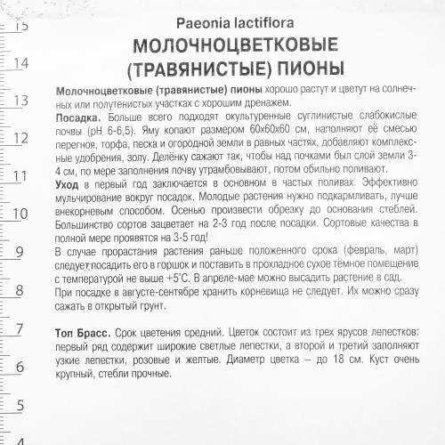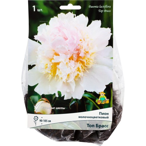 Пион Топ Брасс - высота растения 90-105 см. Срок цветения средний. Цветок состоит из трех ярусов лепестков: первый ряд содержит широкие светлые лепестки, а второй и третий заполняют узкие лепестки, розовые и желтые. Диаметр цветка - до 18 см. Куст очень крупный, стебли прочные.