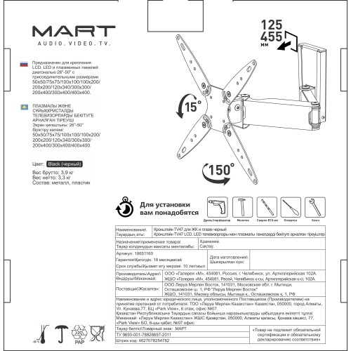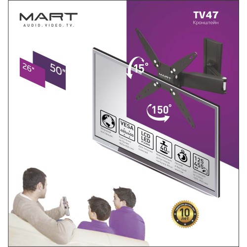 Кронштейн для телевизора Mart TV 47 — это необходимый элемент крепления плазменной или ЖК-панели на стену. Телевизор, установленный таким способом, не занимает полезное пространство и позволяет экономить место. Повышается безопасность, так как исключается вероятность опрокидывания крупногабаритного прибора.