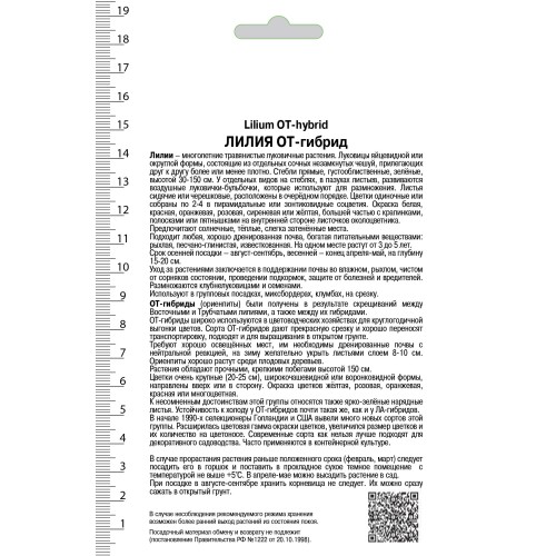 ОТ-гибриды – необыкновенные по красоте лилии. Получены в результате скрещиваний между лилиями восточной и трубчатой и их гибридами. Растения обладают прочными, крепкими побегами. Цветки очень крупные (20-25 см в диаметре), широкочашевидной или воронковидной формы, направлены вверх или в сторону. Массовое цветение начинается во второй половине июля. Широко применяются для круглогодичной выгонки, дают прекрасную срезку, хорошо переносят транспортировку, подходят для выращивания в открытом грунте. На зиму требуют укрытия.