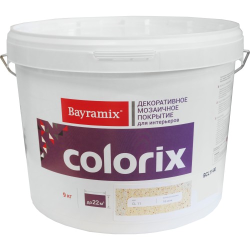 Мозаичное покрытие Bayramix Colorix – декоративное структурное покрытие на водной основе с добавлением чипсов (хлопьев) для придания поверхности оригинального эффекта. Образует прочное долговечное паропроницаемое покрытие. Применяется для окрашивания стен и потолков, архитектурных элементов жилых, офисных, административных помещений, детских учреждений.