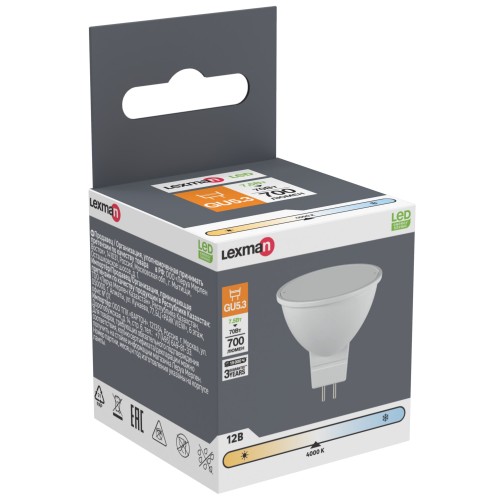 Лампа светодиодная LEXMAN выполнена в форме спота с цоколем GU5.3. Работает при напряжении 12 В. Отличается малым энергопотреблением — 7,5 Вт, относится к высокому классу энергоэффективности — А+. Потребляет на 80% меньше электричества, чем лампа накаливания. Лампочка излучает нейтральный белый свет, соответствующий цветовой температуре 4000 К, что является максимально приближенным к естественному. Матовая колба с узким углом светового потока 100˚ хорошо рассеивает свет и подходит для акцентного освещения. Яркость — 700 лм является альтернативой лампе накаливания мощностью 70 Вт. Лампа рассчитана на работу в течение 15 000 часов и выдерживает 7500 включений/выключений. Срок гарантии 3 года.