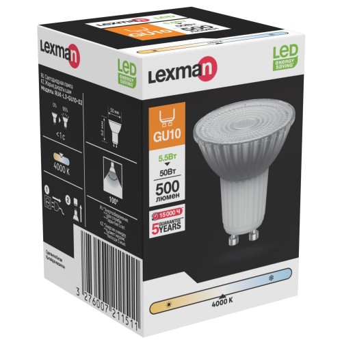 Лампа светодиодная Lexman выполнена в форме спота с цоколем GU10. Работает при напряжении 220-240 В. Отличается малым энергопотреблением — 5,5 Вт, относится к высокому классу энергоэффективности — А++. Потребляет на 80% меньше электричества, чем лампа накаливания. Лампочка излучает нейтральный белый свет, соответствующий цветовой температуре 4000 К, что является максимально приближенным к естественному. Прозрачная колба с узким углом светового потока 100˚ хорошо рассеивает свет и подходит для акцентного освещения. Яркость — 500 лм является альтернативой лампе накаливания мощностью 50 Вт. Лампа рассчитана на работу в течение 15 000 часов и выдерживает 7500 включений/выключений. Срок гарантии 5 лет.