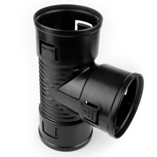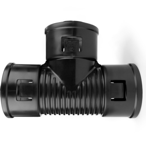 Тройник для дренажной трубы используется для соединения дренажных линий или подключения кольцевого участка к центральной магистрали. Выступы на внутренней поверхности отвечают за фиксацию стыкуемых элементов. Тройник изготовлен из пластика черного цвета. Рассчитан на трубы диаметром 110 мм.