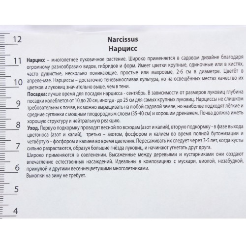 Месторасположение: нарциссы - культура более теневыносливая по сравнению, например, с тюльпанами, но на освещенных местах “урожай” их цветков и луковиц значительно выше, чем в тени. Почва: мирятся с любой почвой, при условии, что она хорошо дренирована и плодородна. На одном месте могут оставаться 3-5 лет. Посадка: высаживать луковицы следует на глубину 15-20 см на расстоянии 10-12 см друг от друга. Лучшее время для посадки луковиц нарциссов август - начало сентября. Если придерживаться этих сроков посадки, луковицы до морозов хорошо укореняются. Пересаживать их следует тогда, когда они сильно разрастаются, образуя большие гнезда луковиц, и начинают угнетать друг друга. Размножение: размножаются сортовые нарциссы только вегетативно. Использование: широко используются в озеленении как раноцветущие растения, в клумбах, рабатках, группах между кустарниками, отдельными пятнами.