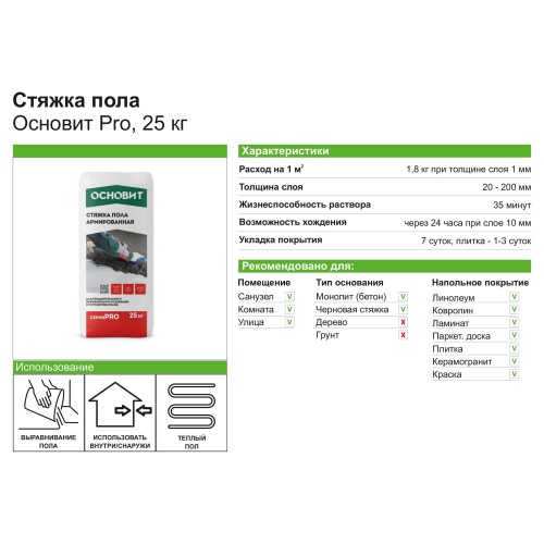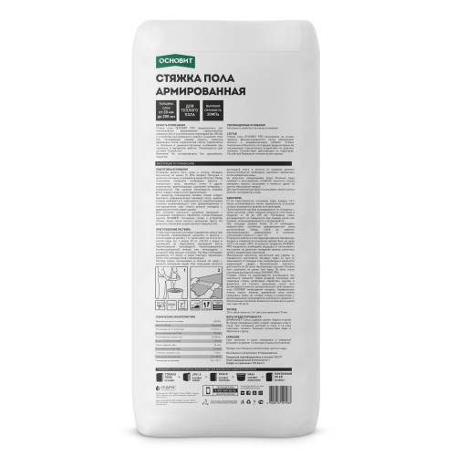 Стяжка пола Основит Pro рекомендуется для устройства всех видов стяжек, в том числе «плавающих» стяжек на разделительном слое, укрытия трубопроводов и придания полу необходимого уклона. Применяется в системе «Теплый пол» для заливки водного теплого пола и в качестве платформы под нагревательные маты. Для внутренних и наружных работ.