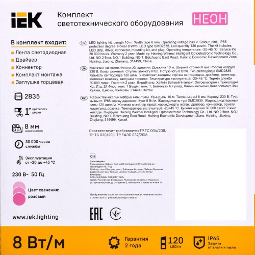 Комплект светодиодной ленты IEK Неон 2835P120 120 диод 8 Вт/м 220 В 80 мм IP65 10 м фиолетовый свет