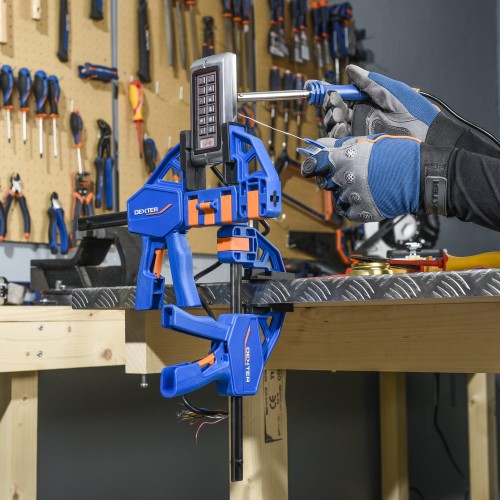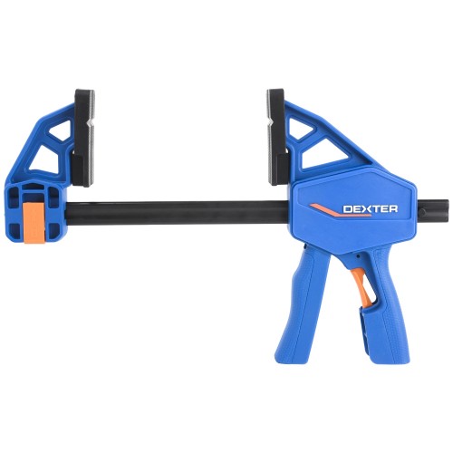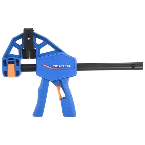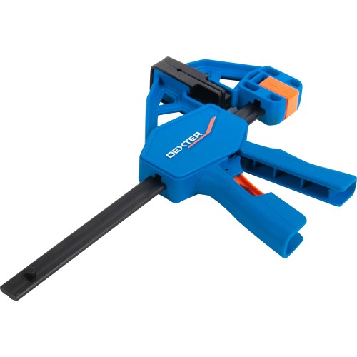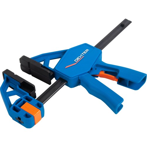 Основа конструкции — шина, на которой закреплены прижимные губки и удобная рукоятка пистолетного типа для прижима деталей. Основной материал — пластик. Струбцина рассчитана на сильное сжатие. Максимальный диапазон зажима составляет 150 мм. Есть функция распорки.