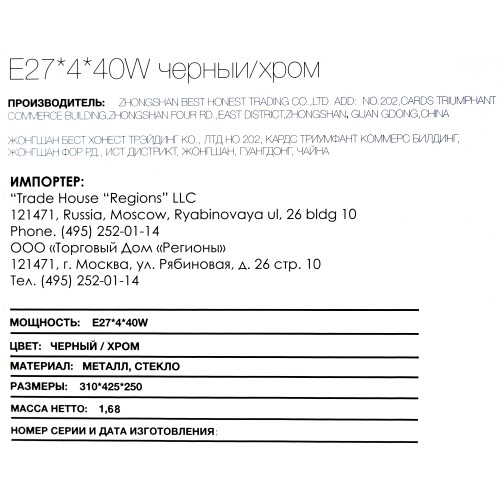 | Максимально допустимая мощность лампы (Вт) | 40 |