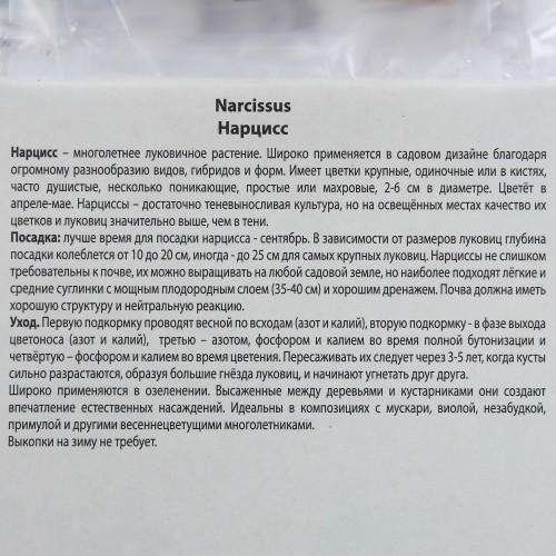 Месторасположение: нарциссы - культура более теневыносливая по сравнению, например, с тюльпанами, но на освещенных местах “урожай” их цветков и луковиц значительно выше, чем в тени. Почва: мирятся с любой почвой, при условии, что она хорошо дренирована и плодородна. На одном месте могут оставаться 3-5 лет. Посадка: высаживать луковицы следует на глубину 15-20 см на расстоянии 10-12 см друг от друга. Лучшее время для посадки луковиц нарциссов август - начало сентября. Если придерживаться этих сроков посадки, луковицы до морозов хорошо укореняются. Пересаживать их следует тогда, когда они сильно разрастаются, образуя большие гнезда луковиц, и начинают угнетать друг друга. Размножение: размножаются сортовые нарциссы только вегетативно. Использование: широко используются в озеленении как раноцветущие растения, в клумбах, рабатках, группах между кустарниками, отдельными пятнами.