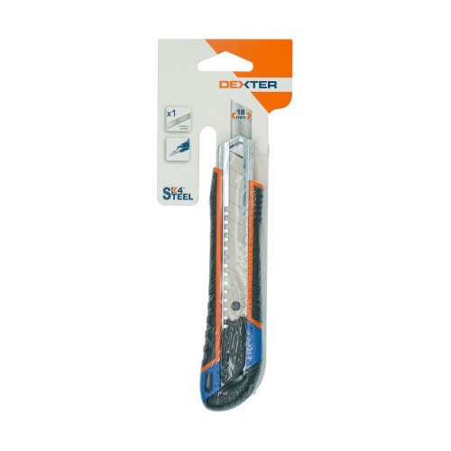 Строительный нож 18 мм би-металл Dexter используется в самых разных работах, где требуется раскроить заготовки из бумаги, картона или гипсокартона. Нож оснащается выдвижным лезвием шириной 18 мм с надежным фиксатором положения. Таким ножом вы сможете быстро отрезать часть материала, придать ему нужную форму. По мере износа лезвия легко меняются, запасные комплекты можно купить вместе с ножом.