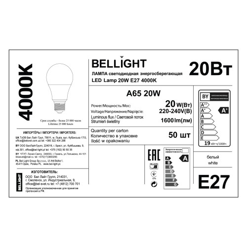 Лампа светодиодная Bellight Е27 груша 20 Вт 1600 Лм нейтральный белый свет