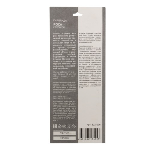 Нить светодиодная Роса с пробкой 20LED предназначена для декорирования бутылок. Совместима с разными видами горлышек. Может использоваться как дополнительный источник света или для зонирования помещения. Эксплуатация происходит в диапазоне температур от 0°С до 40°С. Оснащен светодиодными лампами в количестве 20 штук. Оснащена одним режимом работы. Оболочка изготовлена из термоэластопласта.