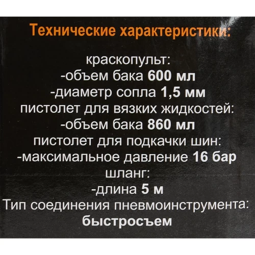 | Состав комплекта | Краскопульт Пистолет для вязких жидкостей Пистолет для продувки Пистолет для накачки шин Спиральный шланг |