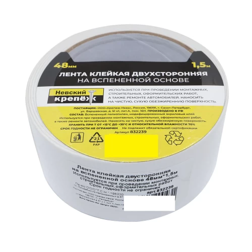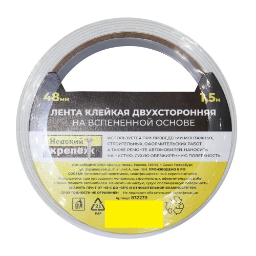 Лента клейкая двусторонняя для внутренних работ Невский крепеж 48 мм х 1.5 м цвет белый