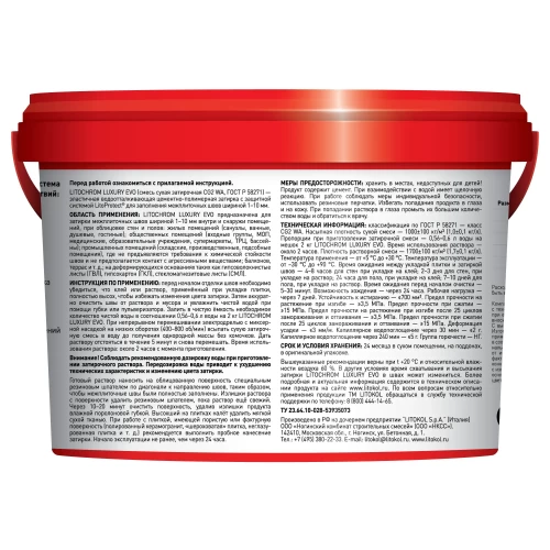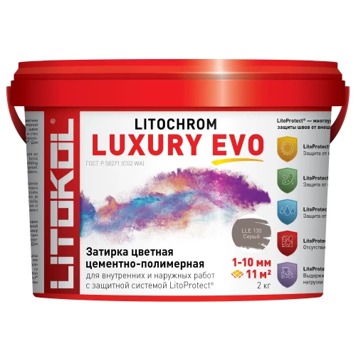 Litokol Litochrom Luxury Evo — Предназначена для затирки швов при облицовке стен и полов керамической плиткой, стеклянной мозаикой, керамогранитом, натуральным камнем, агломератом.