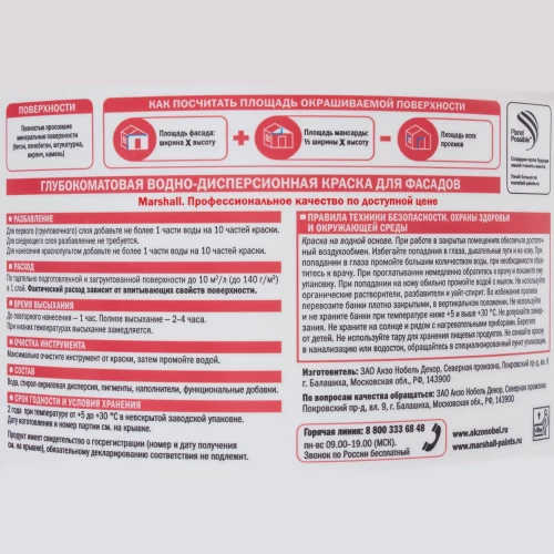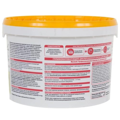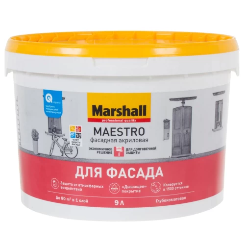 Краска фасадная Marshall Maestro применяется для покраски наружных стен зданий, а также тамбуров, балконов, лоджий, подземных гаражей. Состав на водной основе, не имеет запаха. Краска быстросохнущая: второй слой можно наносить через час, окончательное высыхание происходит через 4 часа. Защитно-декоративное покрытие обладает водоотталкивающим эффектом, скрывает мелкие дефекты основания, на долгое время сохраняет цвет. Продукция произведена в России, фасовка — 9 л.