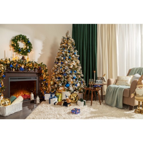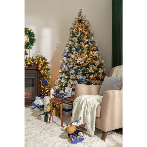 Ель новогодняя искусственная «Заснеженная с шишками» высотой под потолок (210 см) подойдет для украшения просторных жилых помещений, не перегруженных мебелью, а также общественных пространств и торговых площадок.