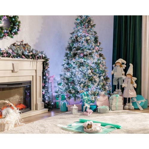 Дерево имеет традиционный зеленый цвет с имитацией заснеженности. Благодаря нарядному виду и солидным габаритам оно гарантированно привлечет внимание гостей и создаст праздничную атмосферу.