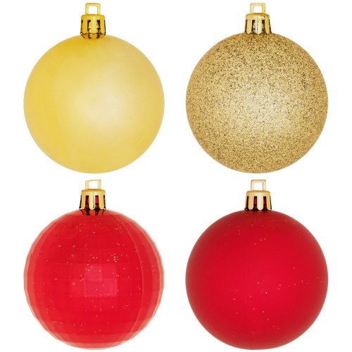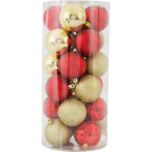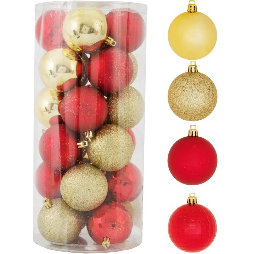 В наборе 24 шт. Размер шаров — 6 см. Цвета — красный и золотистый, внешнее исполнение игрушек подчеркивает волшебную атмосферу зимних праздников, создает приподнятое настроение.