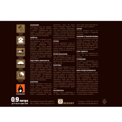 Перед нанесением тщательно перемешать. Продукт не требует разбавления. Наносить в 2-3 слоя с промежуточной сушкой не менее 24 часов, тщательно втирая по направлению древесных волокон. Особо тщательно прокрашивайте торцы древесины. Через 20 минут после нанесения каждого слоя удалить излишки невпитавшегося масла мягкой безворсовой тканью. Не производить окраску в дождь или при повышенной влажности воздуха. Температура при проведении работ не должна опускаться ниже +5°С.При температуре +20°С и нормальной влажности воздуха |