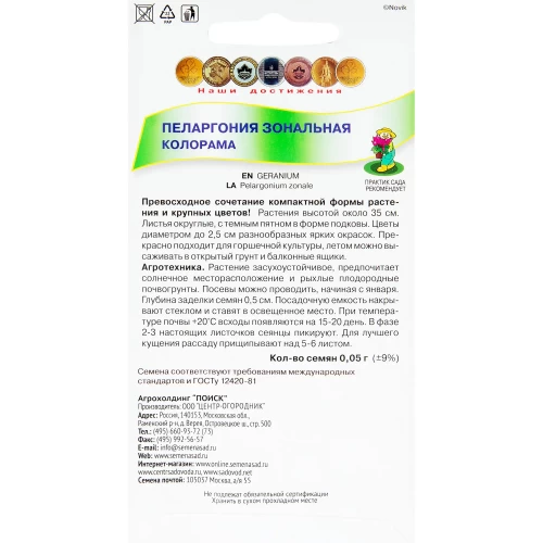 Пеларгония зональная «Колорама» — компактный многолетник для выращивания в комнатных условиях, на балконах и в открытом грунте летом. Куст высотой 35 см, с цветками диаметром до 2,5 см разной окраски. Листья с оригинальными темными пятнами. Растение засухоустойчивое, обильноцветущее, неприхотливое. Семена можно сеять с января. Рассаду над пятым листом прищипывают.