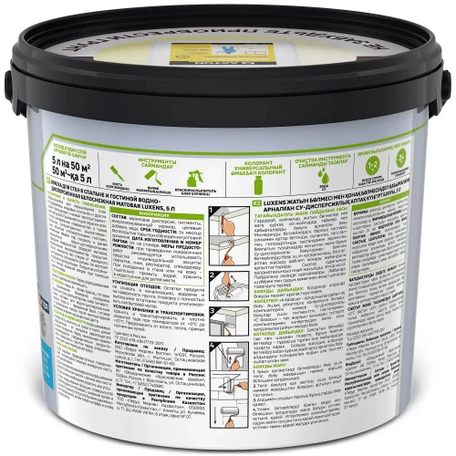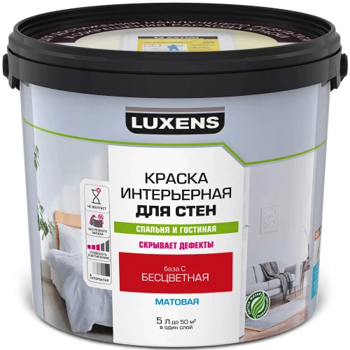 Краска Luxens интерьерная для стен спален и гостиных предназначена для окрашивания стен в гардеробных, кладовых, спальнях и других сухих помещениях с низкой эксплуатационной нагрузкой. Применяется для окраски всех типов минеральных поверхностей, а также бетонных, оштукатуренных, зашпатлёванных, обшитых гипсокартонными листами, оклеенных обоями под покраску и ранее окрашенных водно-дисперсионными красками поверхностей. Образует матовое, белоснежное высокоукрывистое покрытие. Легко наносится, без следов от малярного инструмента. Без резкого запаха. Не желтеет в процессе эксплуатации. «База С» - прозрачная база, готовая к применению только после компьютерной колеровки в яркие насыщенные цвета.