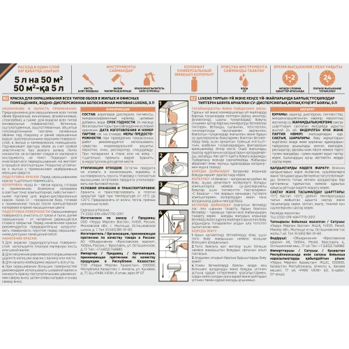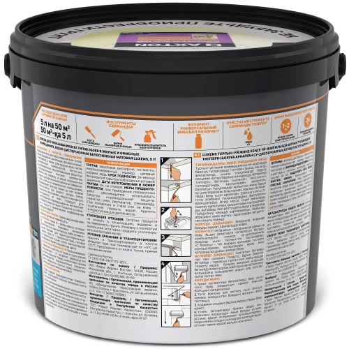 Краска Luxens интерьерная для обоев в жилых и офисных помещениях предназначена для окрашивания всех типов обоев (бумажные, виниловые, фпизелиновые, стеклообои), а также для окраски всех типов минеральных поверхностей, бетонных, оштукатуренных, зашпатлеванных, обшитых гипсокартонными листами, оклеенных обоями под покраску и ранее окрашенных водно—дисперсионными красками поверхностей, в жилых и коммерческих помещениях. Подчеркивает фактуру обоев за счет особой эластичности. Без резкого запаха.Легко наносится, не оставляет следов от малярного инструмента, не течет. Подходит для многократного перекрашивания. Не желтеет в процессе эксплуатации. Покрытие устойчиво к мытью с применением неабразивных моющих средств. «База А» - белая краска, готовая к применению. Возможна колеровка в светлые тона: компьютерная, либо пигментными пастами для водно-дисперсионных красок.
