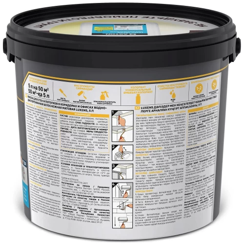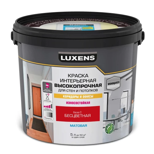 Краска Luxens для стен и потолков в коридорах и офисах предназначена для окраски стен и потолков в помещениях с высокой эксплуатационной нагрузкой, таких как коридоры и офисы. Краска образует покрытие с высокой устойчивостью к истиранию, многократному мытью. Легко наносится на поверхность, не желтеет в процессе эксплуатации. Применяется для окраски всех типов минеральных поверхностей, а также бетонных, оштукатуренных, зашпатлёванных, обшитых гипсокартонными листами, оклеенных обоями под покраску и ранее окрашенных водно-дисперсионными красками поверхностей. Краска образует покрытие с высокой устойчивостью к истиранию, многократному мытью. Легко наносится на поверхность, не желтеет в процессе эксплуатации. «База С» - прозрачная база, готовая к применению только после компьютерной колеровки в яркие насыщенные цвета.