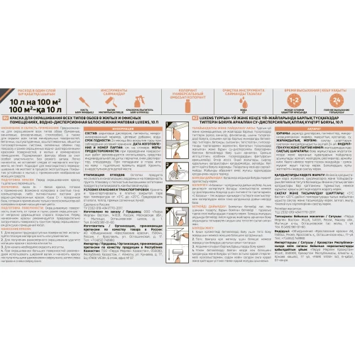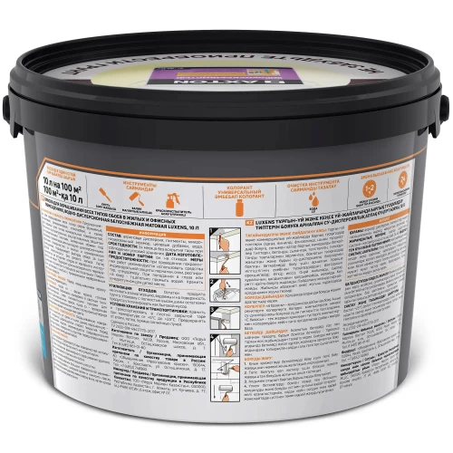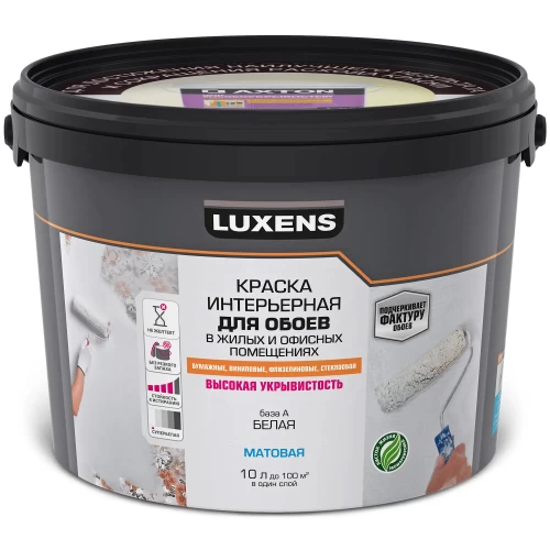 Краска Luxens интерьерная для обоев в жилых и офисных помещениях предназначена для окрашивания всех типов обоев (бумажные, виниловые, фпизелиновые, стеклообои), а также для окраски всех типов минеральных поверхностей, бетонных, оштукатуренных, зашпатлеванных, обшитых гипсокартонными листами, оклеенных обоями под покраску и ранее окрашенных водно—дисперсионными красками поверхностей, в жилых и коммерческих помещениях. Подчеркивает фактуру обоев за счет особой эластичности. Без резкого запаха.Легко наносится, не оставляет следов от малярного инструмента, не течет. Подходит для многократного перекрашивания. Не желтеет в процессе эксплуатации. Покрытие устойчиво к мытью с применением неабразивных моющих средств. «База А» - белая краска, готовая к применению. Возможна колеровка в светлые тона: компьютерная, либо пигментными пастами для водно-дисперсионных красок.