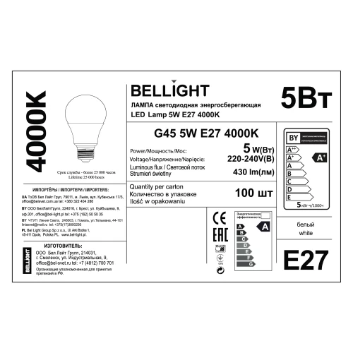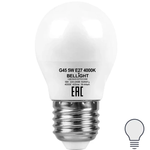 Лампа светодиодная Bellight Е27 шар 5 Вт 430 Лм нейтральный белый свет