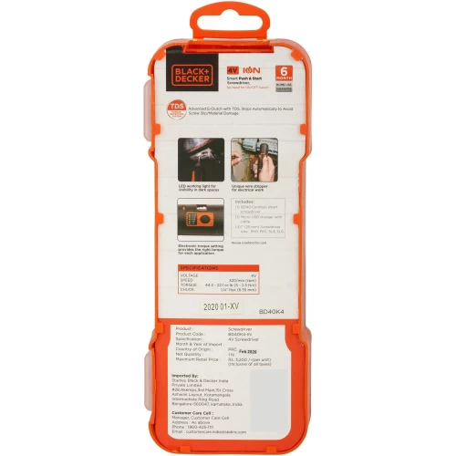 Отвертка аккумуляторная Black&Decker BD40K4, 3.6 В Li-ion 1.5 Ач предназначена для проведения мелких ремонтных работ, сборки и разборки разных конструкций. Оснащена пятью ступенями крутящего момента с максимальным показателем 5 Н*м. Модель оборудована системой защиты аккумулятора с функцией температурного контроля батареи. ### Особенности: - небольшой вес в 0,28 г и корпус эргономичной формы обеспечивают удобство работы с инструментом; - отвертка работает от нажатия кнопки, расположенной на корпусе; - при помощи стриппера можно зачищать провода; - светодиодные индикаторы на корпусе показывают уровень заряда и установленный крутящий момент; - функция реверса позволяет извлечь крепеж, не повредив его и материал; - прорезиненное покрытие рукояти предотвращает выскальзывание инструмента во время работы; - при помощи блокировки шпинделя можно быстро сменить оснастку; - в комплекте есть биты, предназначенные для фиксации саморезов; - при длительном хранении батарея аккумулятора не разряжается.