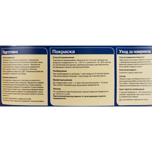 Краска Dulux Ultra Resist предназначена для внутренних работ. Используется в качестве финишного или защитного покрытия стен и потолков в кухне и ванной комнате. Не имеет неприятного запаха, не токсичная, формирует плотное полуматовое покрытие. Выдерживает многократную влажную уборку, не желтеет и не растрескивается со временем.