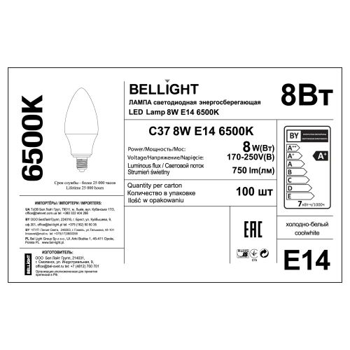 Лампа светодиодная Bellight Е14 175-250 В 8 Вт свеча 750 лм холодный белый свет