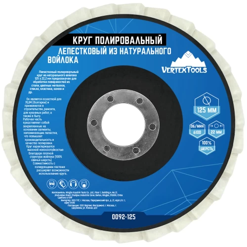 Круг лепестковый войлочный Vertextools 0092-125 предназначен для обработки стеклянных, стальных, пластиковых, каменных поверхностей. Устанавливается на УШМ, применяется в ремонтных, общестроительных, кузовных работах, в быту.