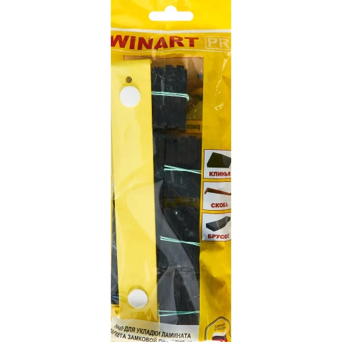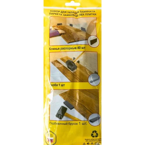 | Применение продукта | Предназначен для работ при укладке ламината, паркета, замковой ПВХ плитки. При помощи клиньев обеспечить рекомендованный производителем напольного покрытия технологический зазор между стеной и краем напольного покрытия. Доски вставляются в торцевые замки до характерного щелчка.В случае необходимости, брусок плотно ( без перекосов) упереть в торец панели напольного покрытия и легким постукиванием обсепечить фиксацию замков смежных панелей по всей длине. Стальная скоба предназанчена для установки последней панели. |