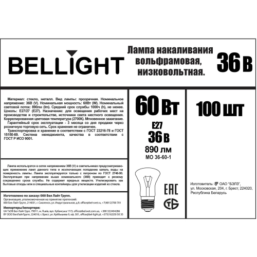 Лампа накаливания Bellight E27 36 В 60 Вт гриб 890 лм теплый белый цвет света для диммера