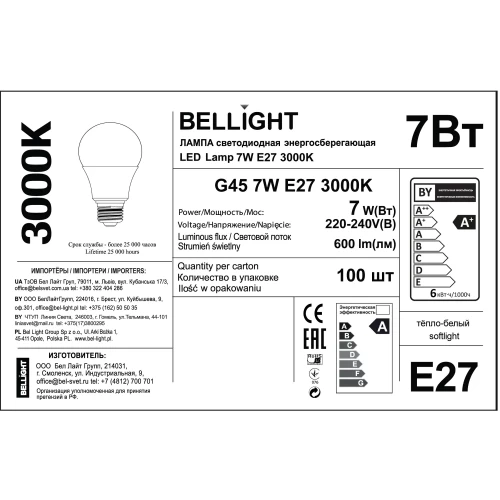 Лампа светодиодная Bellight E27 220-240 В 7 Вт шар 600 лм теплый белый цвет света